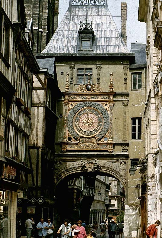 Entrada do Hôtel de Bourgtheroulde. Do início do século XVI datam o Bureau des Finances (começado em 1509) e o Hôtel de Bourgtheroulde, este último um magnífico palácio urbano construído para a família Le Roux em uma mistura entre os estilos gótico e renascentista. Também no século XVI foi construído um dos cartões-postais da cidade: o Grande-Relógio (Gros-Horloge) instalado num arco sobre uma rua. No interior da estrutura renascentista funciona um museu.